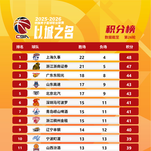 CBA常规赛第二十六轮战罢,最新排名出炉 CBA联赛 CBA联赛官方账号 03.1700:20 关注 #CBA[超话]# 【CBA战绩排名榜】2025-2026赛季CBA联赛常规赛第二十六轮的比赛全部结束,来看看本轮结束后最新的战绩排名情况。#CBA数据库# #以城之名# #竞由新生#