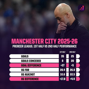 据Opta统计,若本赛季英超只算上半场成绩,曼城目前将以13分优势领跑。