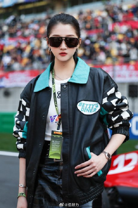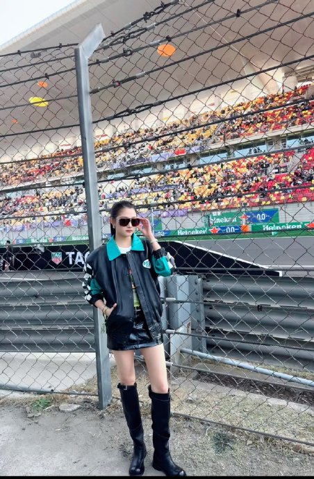关晓彤的造型设计精准传递赛车精神内核:黑色短款机车皮衣、过膝长靴与高马尾墨镜的组合,打造出“冷飒御姐”的视觉符号。生图中逆天长腿与小头小脸的优越比例引发全网热议,“一眼望去全是腿”“生图杀手”等标签刷屏。这种视觉冲击力将赛车场转化为时尚秀场,吸引大量非赛车迷群体关注赛事。同时,她与梅赛德斯车手拉塞尔的破次元同框,以松弛姿态实现体育与娱乐的无缝衔接,进一步打破圈层壁垒。