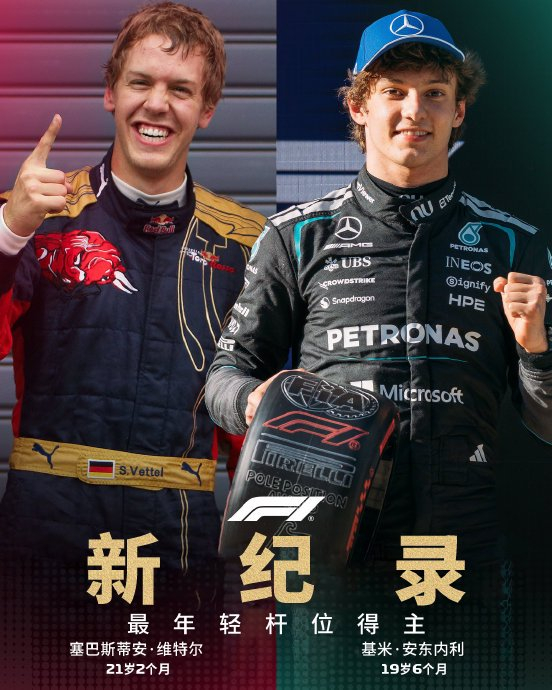 在3月14日的排位赛中,安东内利以 1:32.064 的单圈成绩力压群雄。这一成绩不仅让他斩获生涯首个杆位,更以 19岁6个月17天(部分记录标注为19岁201天)的年龄,大幅刷新四届世界冠军塞巴斯蒂安·维特尔于2008年意大利站创下的 21岁72天 的纪录,将F1“最年轻杆位”门槛提前近两年。此前榜单中的勒克莱尔(21岁5个月)、阿隆索(21岁7个月)等名将均被其超越。
