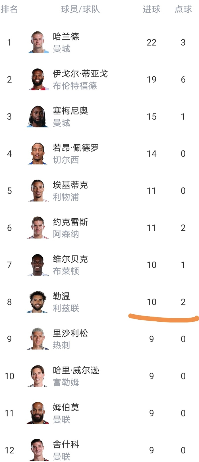 射手榜8人进球上双。