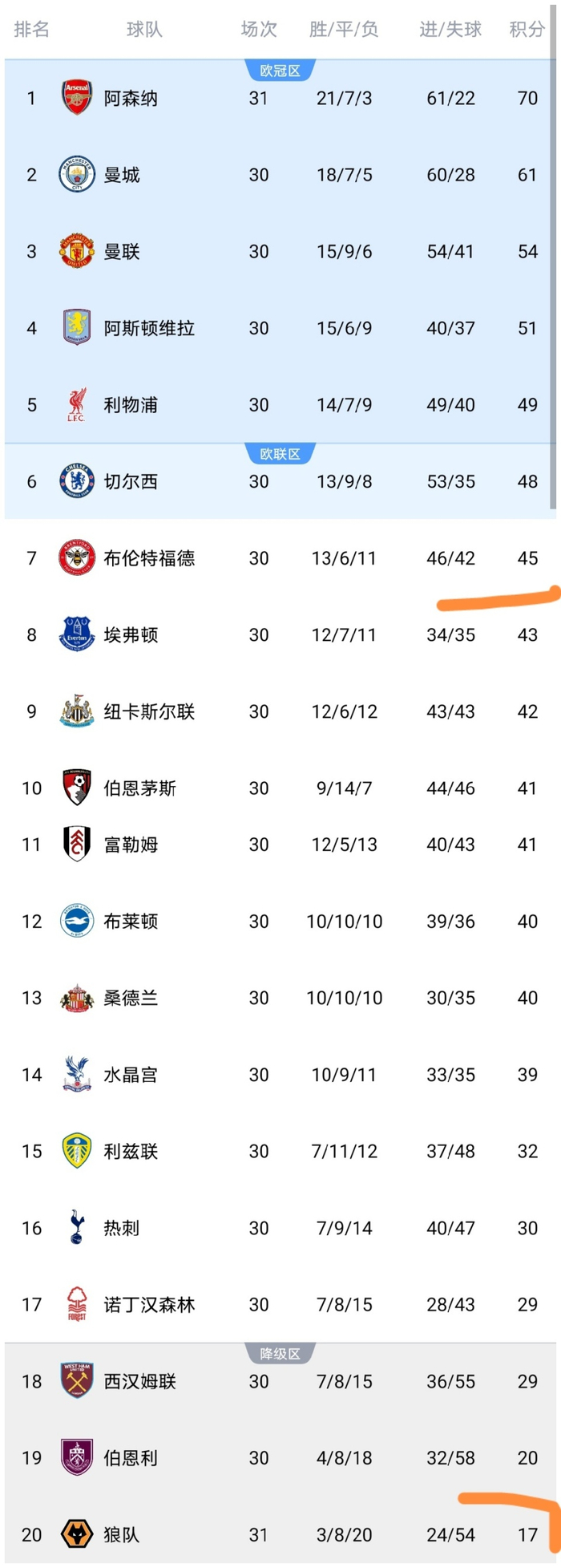 赛后英超最新积分榜显示,布伦特福队积分仅上涨到了45分,依然落后欧战区3分,而狼队依然排名倒数第一,保级压力依然巨大,也可以说保级希望依然渺茫。