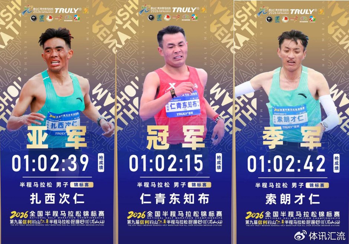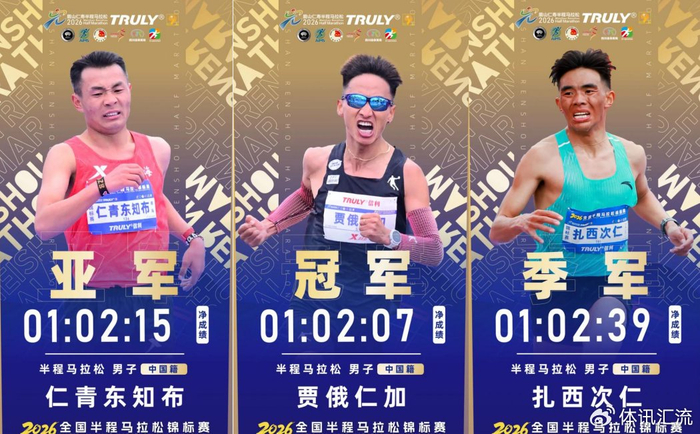 仁青东知布以01:02:15的枪成绩获得2026全国半程马拉松锦标赛男子组冠军,扎西次仁以01:02:39的枪成绩获得亚军,索朗才仁以01:02:42的枪成绩获得季军。