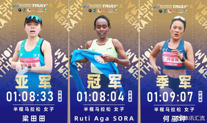 Ruti Aga SORA以01:08:04夺得半程女子第一名,梁田田以01:08:33夺得半程女子第二名,何巫呷以01:09:07夺得半程女子第三名,Meseret ABEBAYEHU以01:09:33夺得半程女子第四名,Aamelmal BIRARA TAGEL以01:09:42夺得半程女子第五名,刘敏以01:09:48夺得半程女子第六名,Gladys Chesir KIPTAGELAI以01:10:02夺得半程女子第七名,刘君慧以01:10:27获得半程女子第八名。