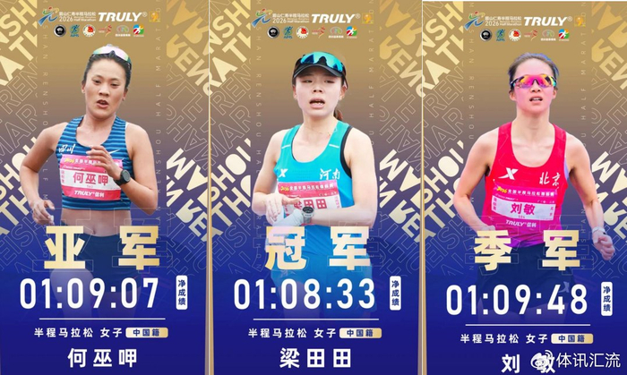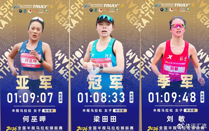 梁田田以01:08:33的枪成绩获得2026全国半程马拉松锦标赛女子组冠军,何巫呷以01:09:07的枪成绩获得亚军,刘敏以01:09:48的枪成绩获得季军。