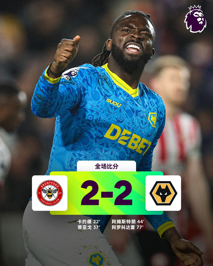 如果你只看比分板,布伦特福德2-2狼队,这不过是英超第30轮一场普通的平局。