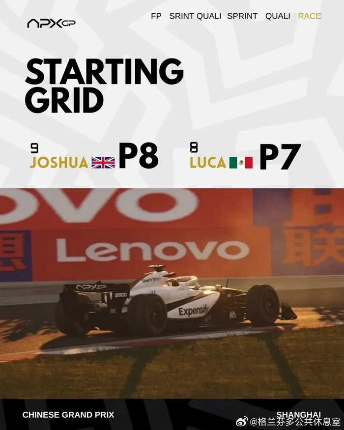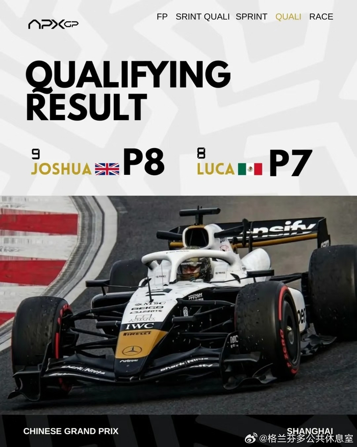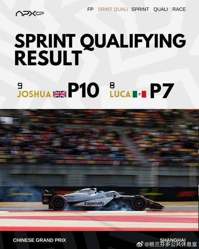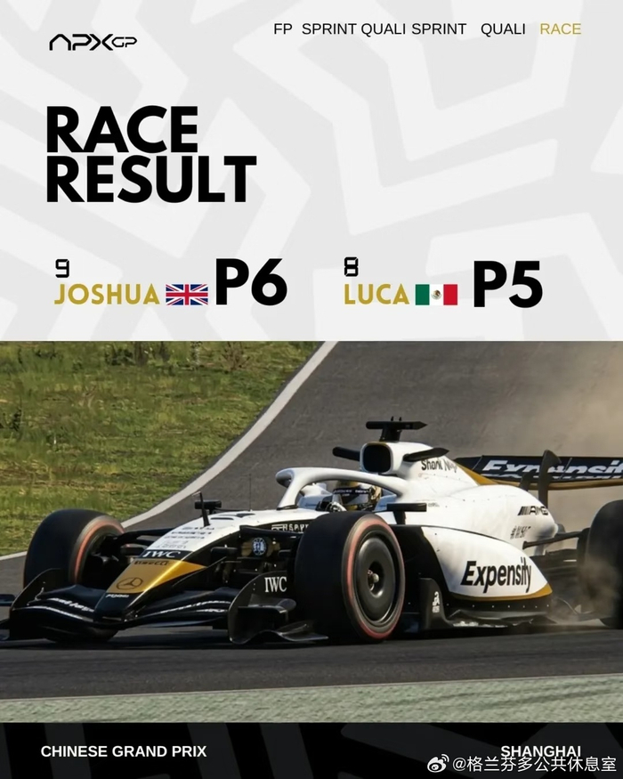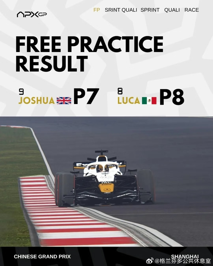 APX GP车队F1上海站正赛获P6与P5 格兰芬多公共休息室 03.1709:17 关注 《F1: 狂飙飞车》继续售后!!!APX GP车队公布F1 26赛季上海站成绩!练习赛P7与P8短程排位赛P10与P7冲刺塞P7与P4晋级赛P8与P7热身赛P8与P5正赛P6与P5