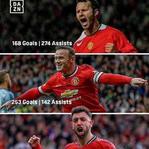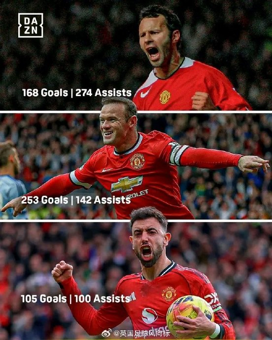 在曼联辉煌的历史长卷中,“进球助攻双百”是衡量攻击手全面性与持久性的顶级标尺,这一殿堂级成就至今仅有三位传奇巨星达成——威尔士魔翼吉格斯、英格兰锋霸鲁尼,以及葡萄牙中场核心布鲁诺·费尔南德斯(B费)。