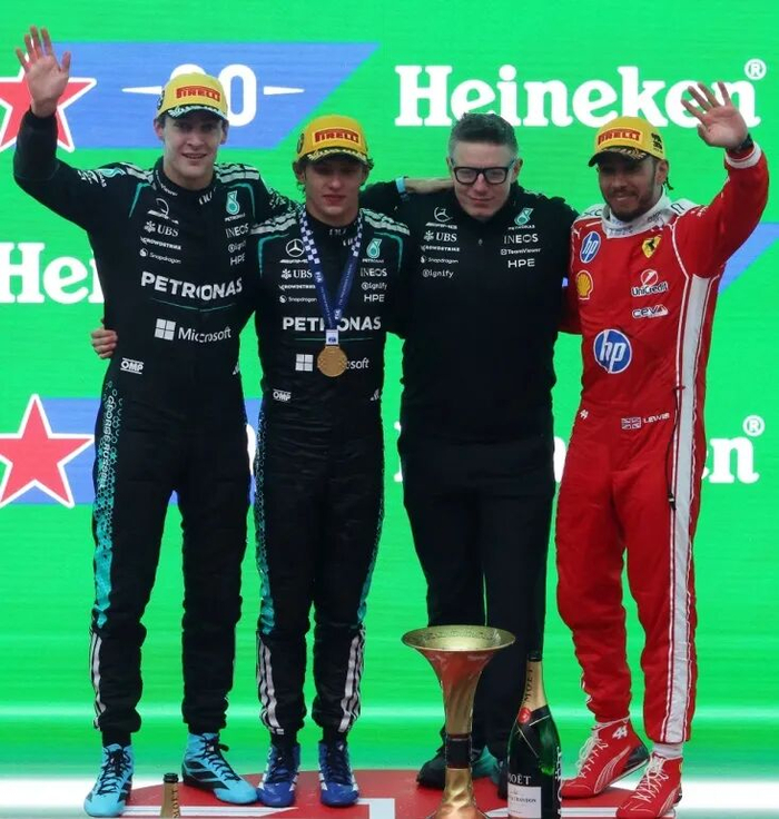 左起:拉塞尔、安东内利、邦宁顿(梅赛德斯车队比赛工程师)、汉密尔顿