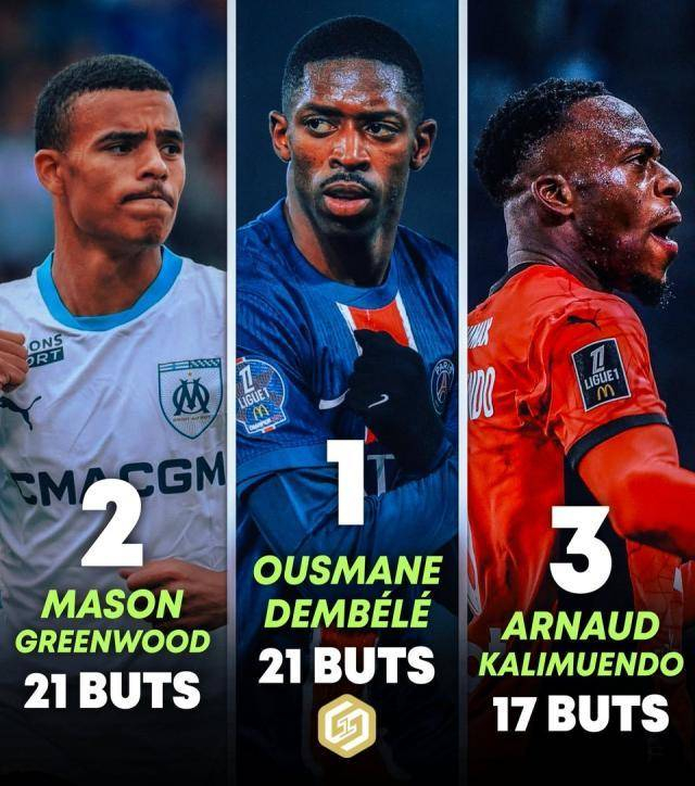 马赛4比2大胜雷恩,格林伍德上半场2球1助(射失1粒点球),追平登贝莱,以21球并列,登贝莱在对欧塞尔的比赛未能进球。不过格林伍德有1/3的进球是点球(7点),而登贝莱只进了1个点球(并且进球效率更高,助攻也更多),按照规则登贝莱获得法甲金靴奖。