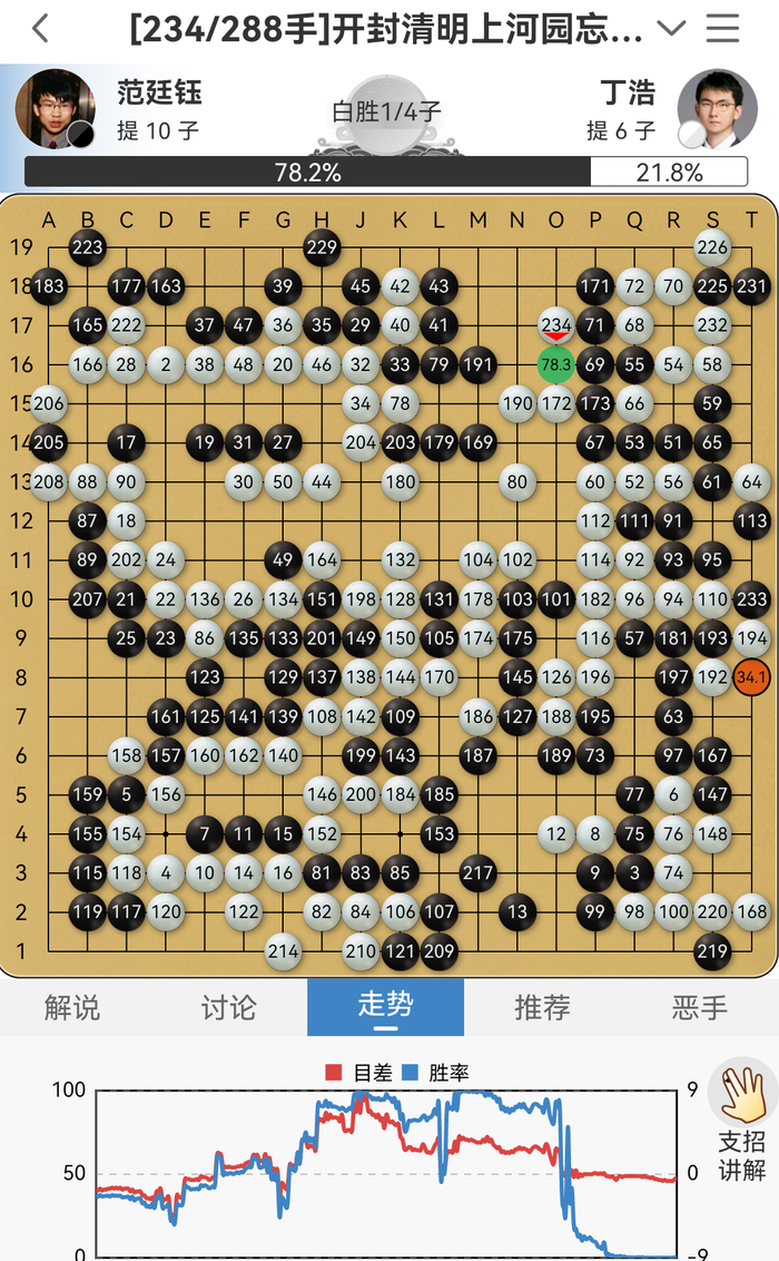 挑战赛首局范廷钰执黑三三、小目开局,丁浩星小目应对,积极抢捞实地。范廷钰则弃子取势,在下方围出大空取得领先。