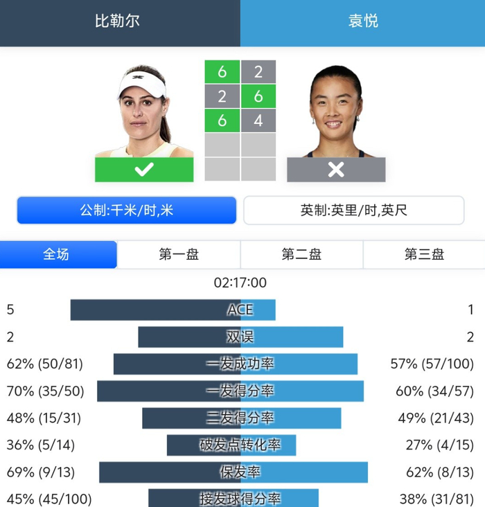 可惜袁悦未能再现首轮那样令人狂喜的逆转剧本,终因为拼得太凶,导致关键时刻体能下降,被体能狂魔比勒尔以6比4结束战斗,赐予了她两连败,同时也将她挡在了迈阿密1000赛正赛门外。