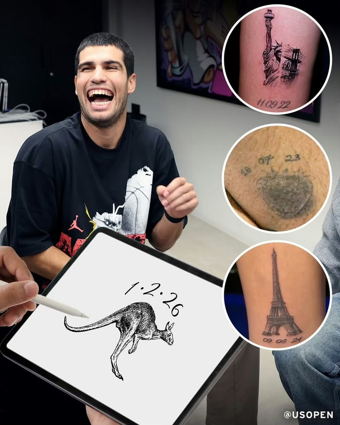 这一抹墨痕,是阿尔卡拉斯送给自己澳网夺冠的礼物。在今年澳大利亚网球公开赛男单决赛中,阿尔卡拉斯击败了传奇球星德约科维奇,不仅首次在墨尔本公园捧杯,更以22岁的年龄成为网球史上最年轻的全满贯冠军得主 。赛后他便透露,要用澳洲的国宝袋鼠来铭记这一荣耀时刻 。
