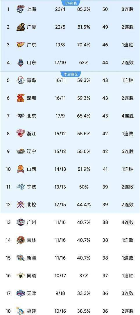 CBA排名乱套了!辽宁六连胜杀回前九,上海八连胜稳坐榜首