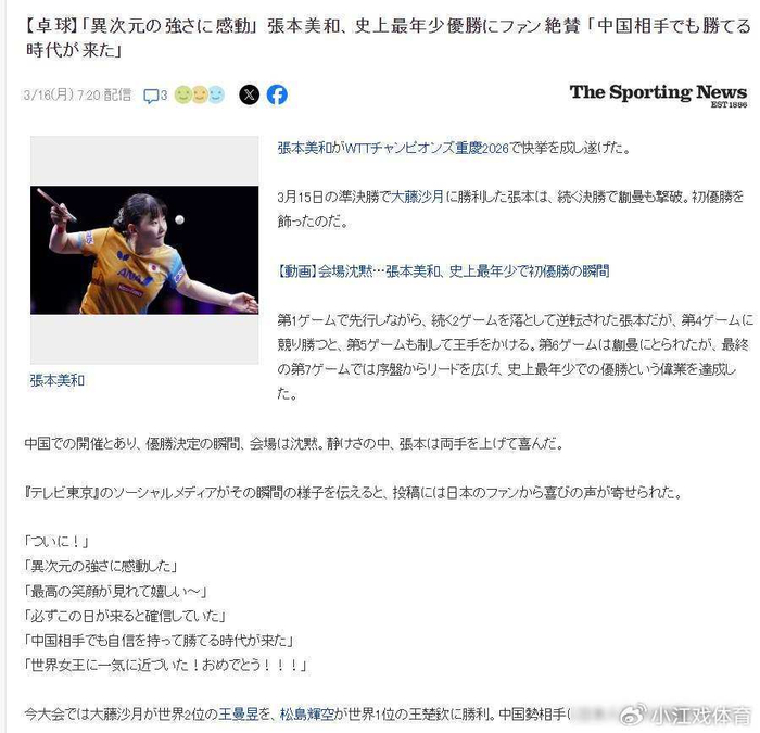 日本那边反应挺大,以前大家总把张本美和叫作“张本智和的妹妹”,现在不这么称呼了,她在全锦赛刚拿过四冠,这次又夺冠,粉丝留言说不再盼着中国选手失误,而是真希望她赢,这种心态转变说明张本美和已经不是陪跑角色。