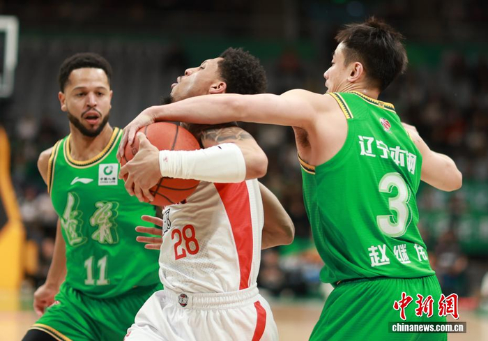 3月18日,在辽宁沈阳举行的2025-2026赛季中国男子篮球职业联赛(CBA)常规赛第27轮比赛中,辽宁本钢队主场以97比86战胜广州朗肽海本队。图为辽宁本钢队球员莫兰德(中)在比赛中拼抢。中新社记者 于海洋 摄