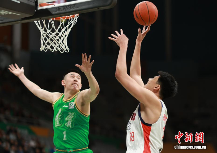 3月18日,在辽宁沈阳举行的2025-2026赛季中国男子篮球职业联赛(CBA)常规赛第27轮比赛中,辽宁本钢队主场以97比86战胜广州朗肽海本队。图为广州朗肽海本队球员徐昕(右)在比赛中投篮。中新社记者 于海洋 摄