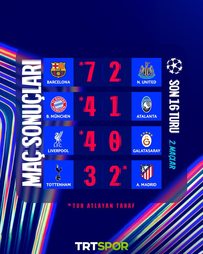 (巴塞罗那🇪🇸、拜仁慕尼黑🇩🇪、利物浦🏴󠁧󠁢󠁥󠁮󠁧󠁿、马德里竞技🇪🇸晋级八强)