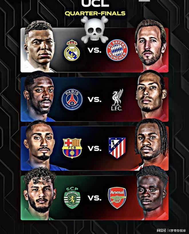 球迷提示:1/4决赛首回合将于4月7日、8日打响,次回合于4月14日、15日进行,所有比赛均在北京时间凌晨3:00开球,请球迷们提前备好咖啡,准备熬夜见证豪门生死战。