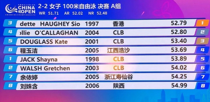 3月19日,2026年中国游泳公开赛暨全国春季游泳锦标赛迎来首个比赛日。在晚间决赛竞赛单元女子100米自由泳决赛的比赛当中,中国香港名将以52秒79的成绩拿到了金牌,澳大利亚名将、5枚奥运金牌得主奥卡拉汉以0.01秒之差获得了亚军。