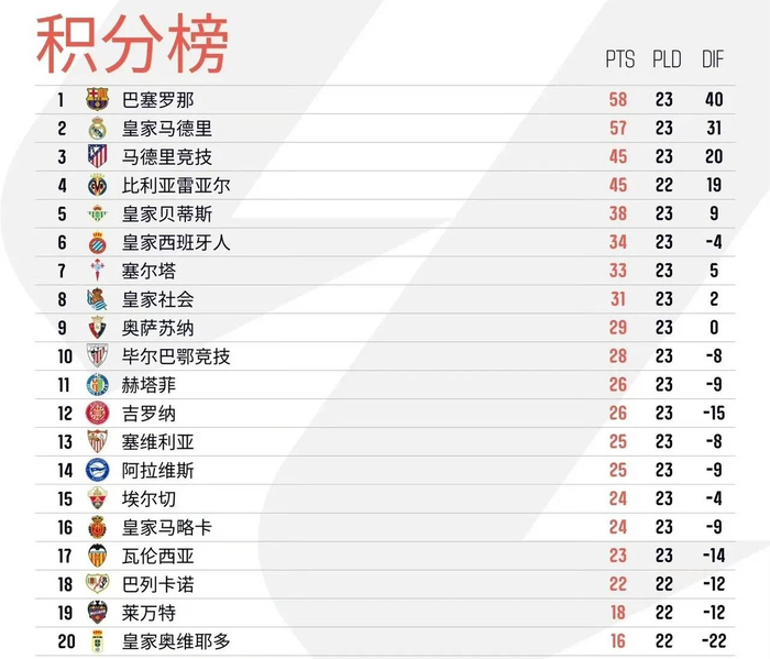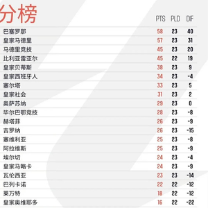 西甲第23轮比赛已经全部结束了,除了马竞0-1爆冷不敌贝蒂斯外,其余比赛基本上没有什么意外,巴萨3-0马洛卡继续以58分领跑积分榜,皇马2-0瓦伦西亚以57分紧追巴萨,排名第3的马竞竟然落后皇马多达12分,西甲又回到了皇萨二人转时代了。