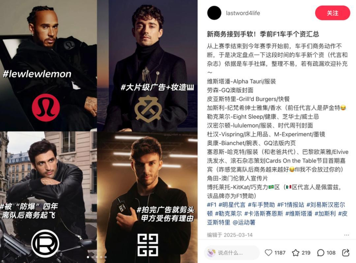 同时,车手的角色也随之发生变化。过去,他们的影响力更多依赖赛道成绩;而现在,则是成绩、个性与内容表达的综合产物。最典型的是刘易斯·汉密尔顿,作为“F1 常青树”,他不仅拥有七次世界冠军头衔,还手握 Dior、lululemon 等覆盖奢侈品、时尚、科技、生活方式、运动健康多个领域的超过 40 个代言。