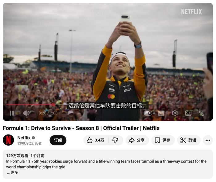 最重要的转折点是与 Netflix 共同推出的纪录片《极速求生》(Drive to Survive),目前已播出七季,《极速求生》采用群像真人秀的方式讲述车手与车队的故事,放大了人物关系和戏剧冲突,被戏称为“围场版与卡戴珊同行”,吸引了大量年轻观众入坑。