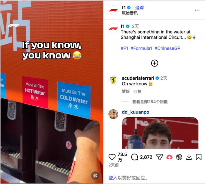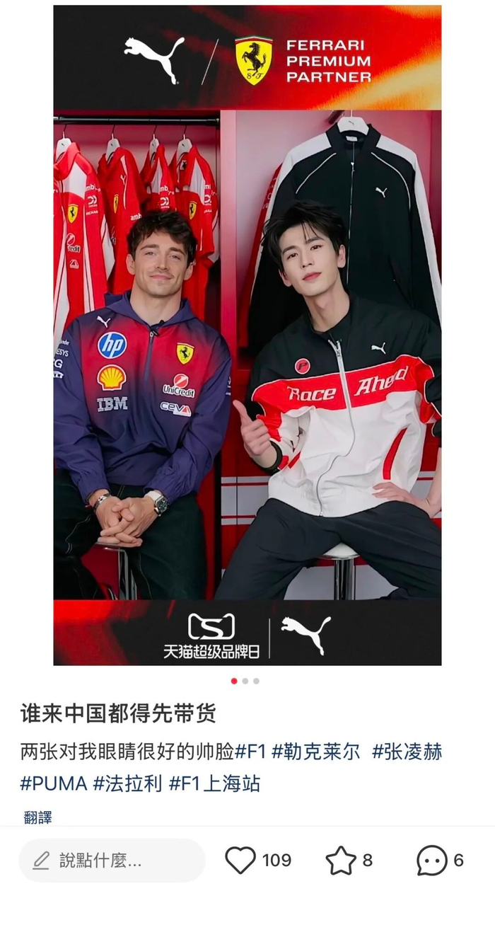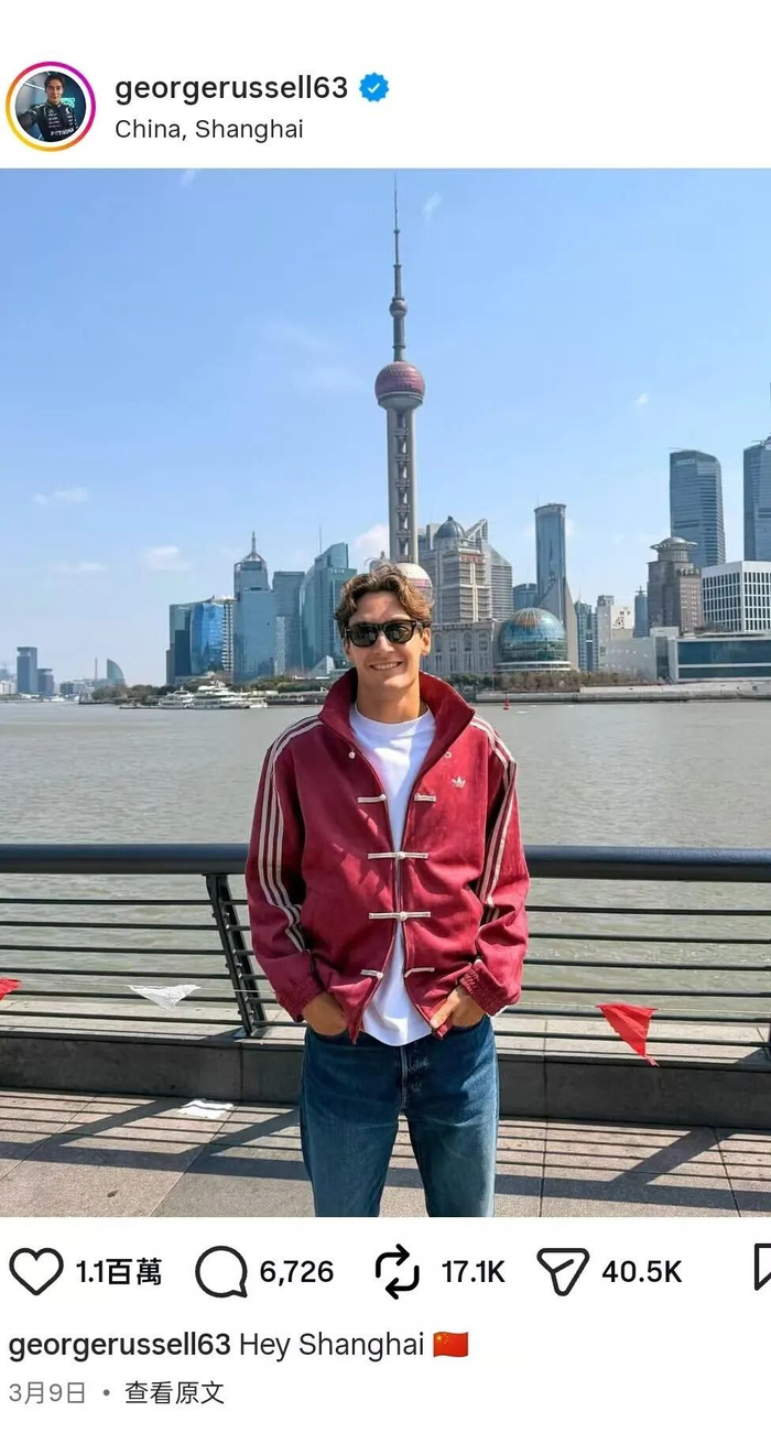 而在小红书上,F1 车手们的中国行也成了社交热梗。汉密尔顿在九寨沟骑马之余,不忘帮陌生游客出片;拉塞尔身穿阿迪达斯“新中式”打卡外滩;勒克莱尔则现身 puma 直播间带货。这些画面与赛场上的激素狂飙形成了奇妙的反差。
