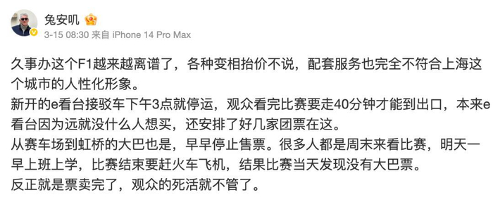 从这个标准来看,今年上海站造成的舆论风波,离不开商业化到位了,但体验没跟上造成的反噬。这些细节的缺失才是真正应该被诟病——23 万观众在场导致手机网络瘫痪,无法实时查看数据或分享体验;散场大巴接驳不足,导致大量观众滞留;检票口排队过长,部分观众错过开场,餐饮供应不足,价格昂贵等。