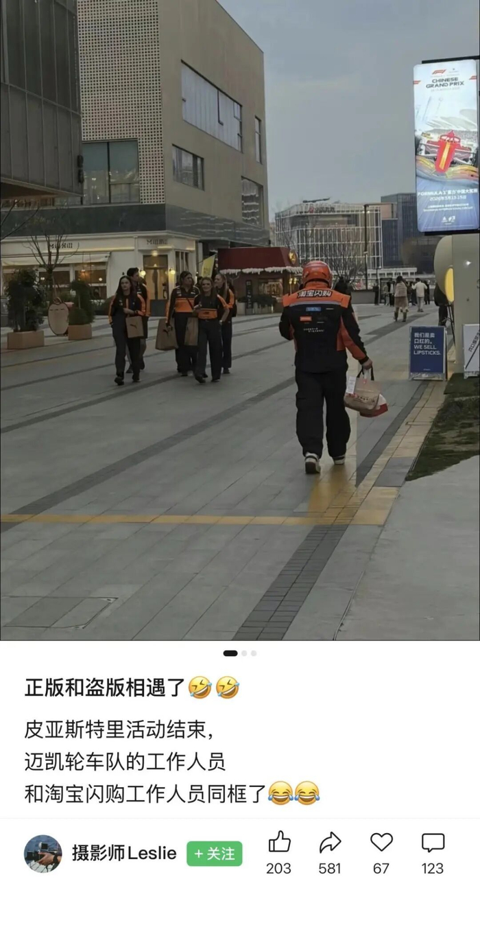 淘宝闪购,采用的则是典型的中国式营销策略。此前,网友曾调侃迈凯伦队服像极了淘宝闪购骑手,法拉利则像京东快递。淘宝闪购顺势官宣成为 F1 中国大奖赛尊耀合作伙伴,以幽默自黑的方式破圈。
