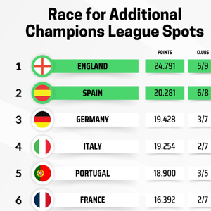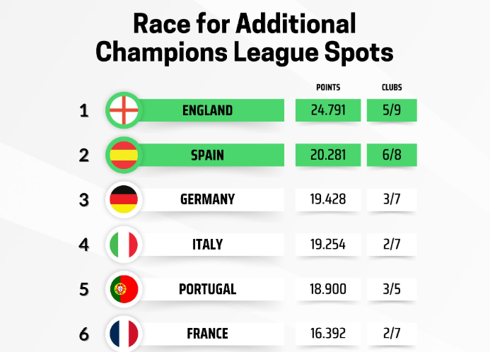 据统计,英格兰球队目前仅需要一场平局就可以锁定一个额外名额的席位(前两名),而西班牙虽然被身后的德国、意大利、葡萄牙紧紧追赶,但是他们有6支球队晋级了欧战各项赛事的1/4决赛。