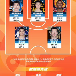 2025-2026赛季CBA联赛常规赛第27轮结束较量,来自@福建浔兴SBS男篮 的@邹阳_5 ,@浙江广厦篮球俱乐部 的@胡金秋21 ,@山西汾酒职业篮球俱乐部 的迪亚洛,@上海久事大鲨鱼官方微博 的@李添荣Tr 和@南京同曦篮球俱乐部 的@郭昊文- 入选CBA联赛常规赛第27轮最佳阵容!