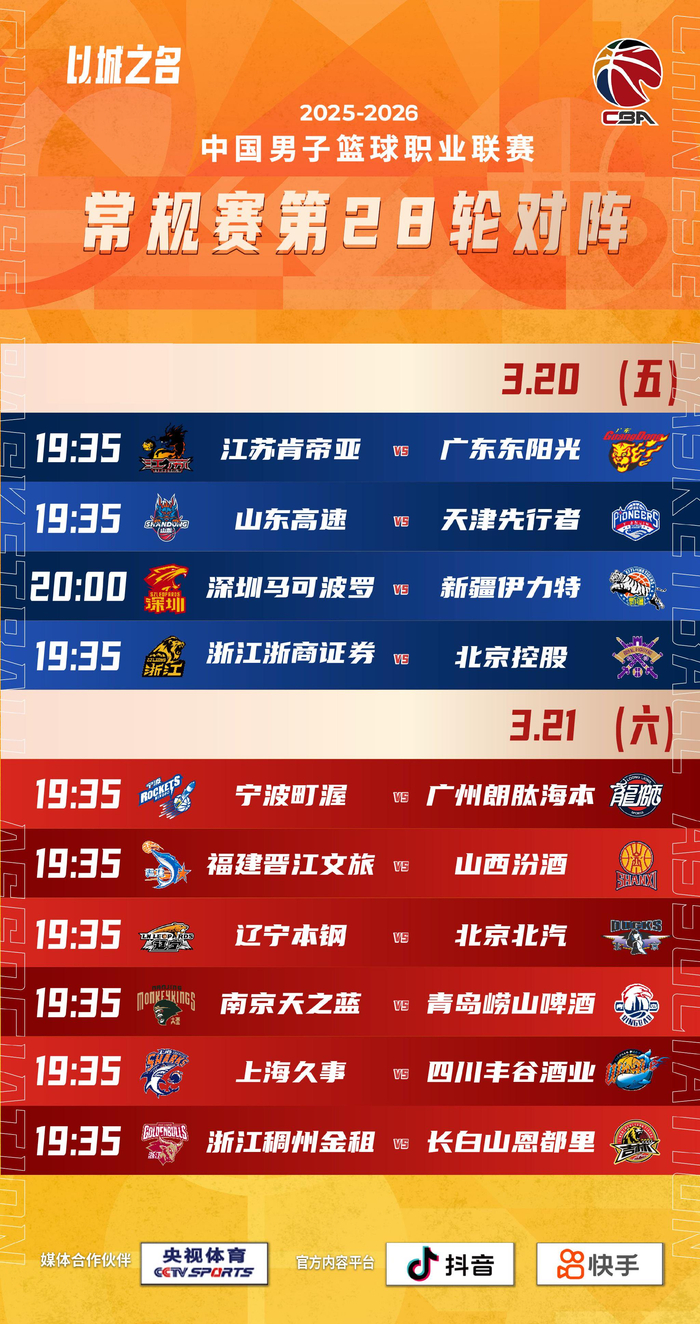 2025-2026赛季CBA常规赛第二十八轮今日开战 CBA联赛 CBA联赛官方账号 03.2010:05 关注 #CBA[超话]# 2025-2026赛季CBA联赛常规赛第二十八轮今日展开争夺!第二十八轮比赛将分为2个比赛日进行,看点十足!你最期待哪场比赛呢?#以城之名# #竞由新生#