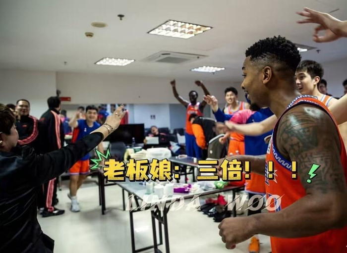 赛后,皮特森带领全队在更衣室集体高呼“三倍、三倍”,福建队老板娘随即豪爽竖起三根手指说到:“三倍!”