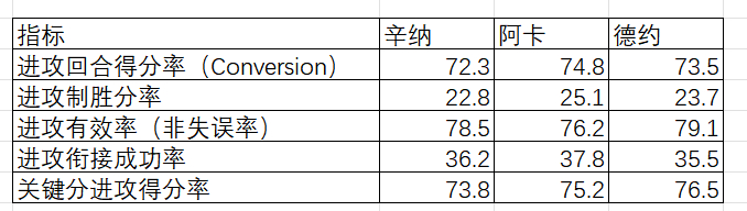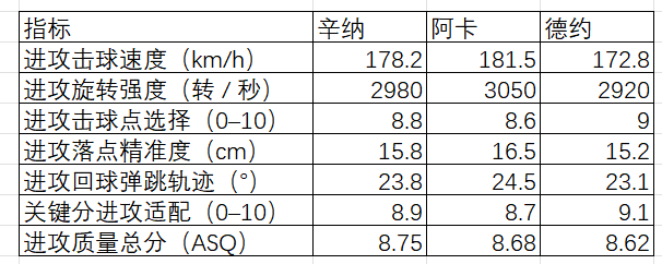 (2)效率维度:阿卡进攻回合得分率、制胜分率、衔接成功率领先,进攻终结效率最高;德约关键分进攻得分率、进攻有效率最强,抗压与稳定性顶级;辛纳各项效率均衡,无明显短板。