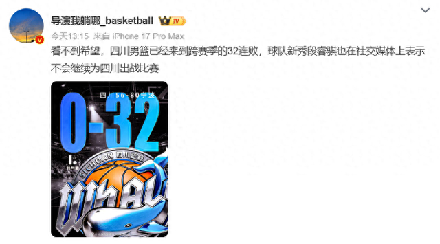 北京时间3月20日,中国篮坛被一则消息震动:20岁的国青队长、四川男篮新星段睿骐通过社交媒体公开宣布,将不再为球队出战接下来的CBA常规赛。这位被视为中国男篮未来希望年轻人的愤怒发声,撕开了一家昔日总冠军球队长期运营崩溃的遮羞布:俱乐部拖欠薪资已长达两年之久,社保断缴,外援跑光,战绩跌至史无前例的跨赛季32连败。