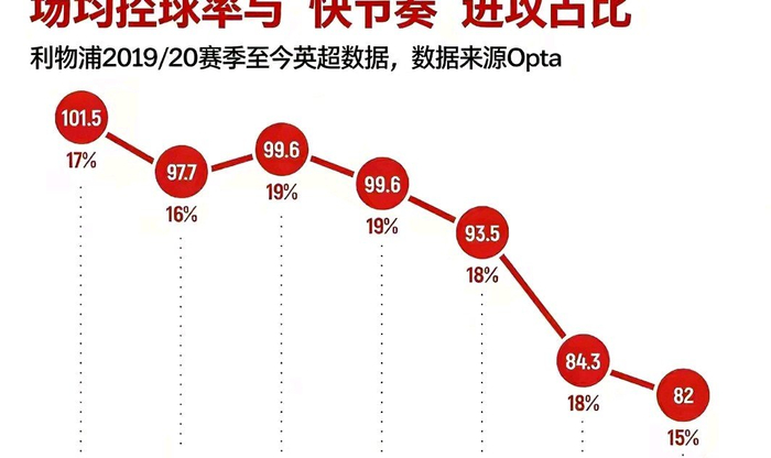 如今利物浦的运动战进球,几乎全靠球员个人灵光一现,再也看不到行云流水的体系配合,一组数据足以说明问题:本赛季至今,利物浦在比赛开场20分钟里只打进4球;30轮英超的上半场,全队总共只有18个进球,分散在12场比赛里,对于曾经靠开场闪击吃饭的红军来说,这简直是奇耻大辱。