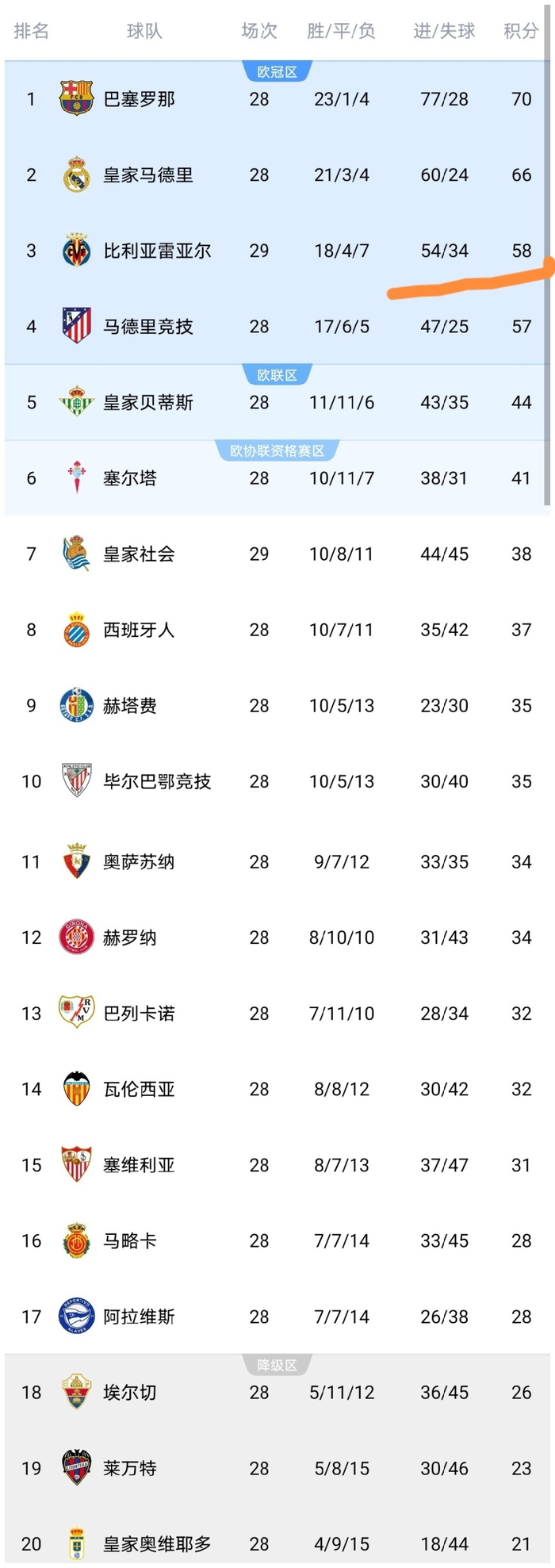 可以看到比利亚雷亚尔队赢球之后,积分上涨到了58分,暂时反超马竞升至第3,而皇家社会积分停留在了38分,继续排名第7。