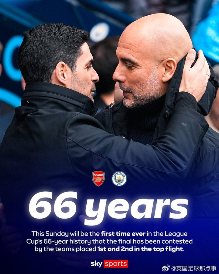 天空体育:本周日将是英格兰联赛杯66年历史上首次由联赛前两名会师决赛🏆#阿森纳vs曼城#