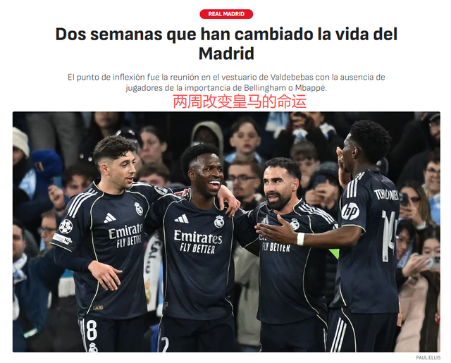 3月2日的西甲,皇马0-1负于赫塔菲,遭遇西甲2连败。当时的皇马更衣室,情绪低落,氛围沮丧,陷入危机之中;3月17日,皇马在欧冠1/8决赛淘汰曼城,全队信心十足:“我们能获得西甲和欧冠冠军。”