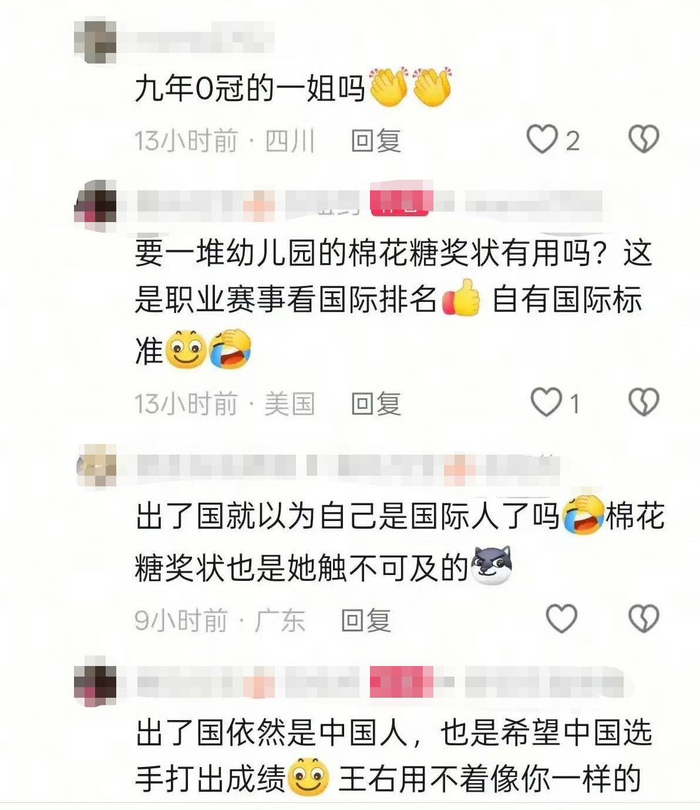 而对此,又有网友表示,“九年0冠的一姐吗?”郑赛赛妈妈再次回怼道,“要一堆幼儿园的棉花糖奖状有用吗?这是职业赛事看国际排名自有国际标准!……出了国依然是中国人,也是希望中国选手打出成绩,王右用不着像你一样的!”