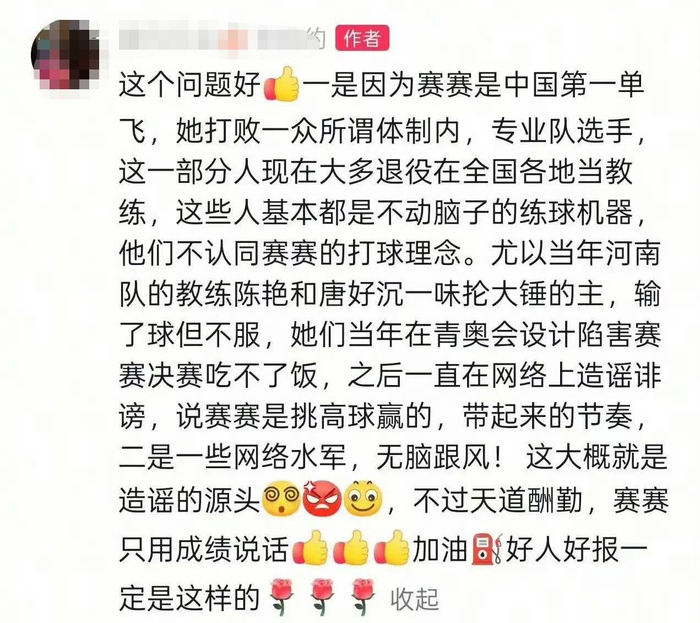 网友们愤愤不平,但郑赛赛妈妈似乎仍然意犹未尽,她发文力证自己女儿的执教能力,“这个问题好!一是因为赛赛是中国第一单飞,她打败一众所谓体制内,专业队选手,这一部分人现在大多退役在全国各地当教练,这些人基本都是不动脑子的练球机器,他们不认同赛赛的打球理念。尤以当年河南队的教练陈艳和唐好沉一味抡大锤的主,输了球但不服,她们当年在青奥会设计陷害赛赛决赛吃不了饭,之后一直在网络上造谣诽谤,说赛赛是挑高球赢的,带起来的节奏,二是一些网络水军,无脑跟风! 这大概就是造谣的源头,不过天道酬勤,赛赛只用成绩说话。加油!好人好报一定是这样的!”