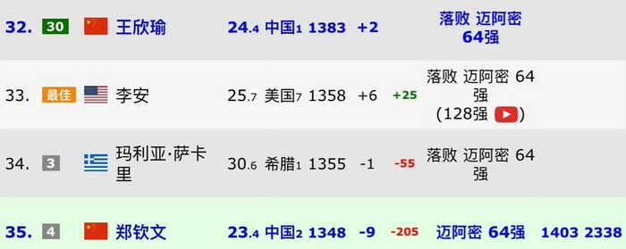 原来,起因是迈阿密网球赛开始后,郑钦文被扣除了去年八强的分数,排名直线滑落到了第35位,而王欣瑜凭借第32位的排名位列中国一姐。这里,说句题外话,由于王欣瑜目前迈阿密站止步第二轮,因此,下下周积分定格在1383;而目前郑钦文拥有1348分,因此,只要赢下一场(1403),就能确保下下周依旧保住中国一姐的位置。