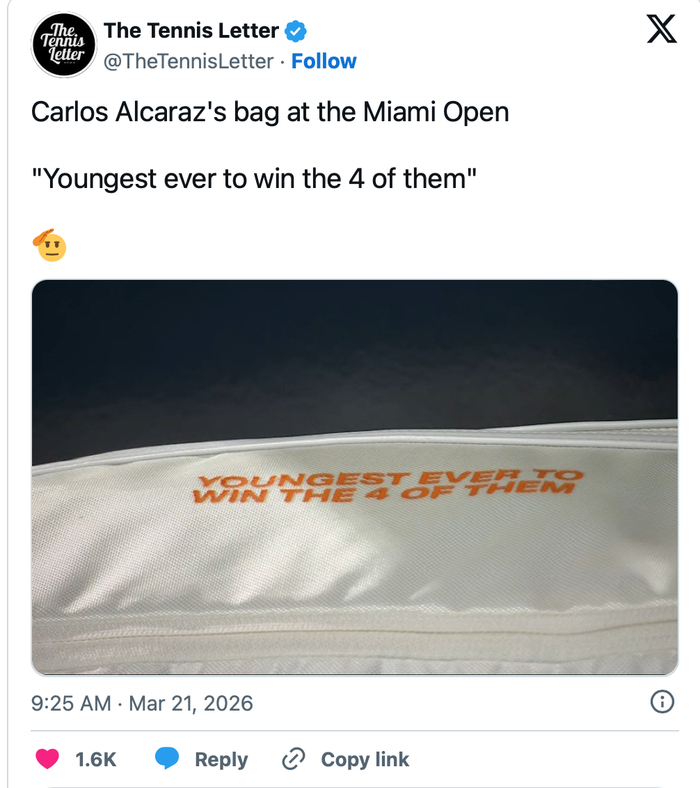 尽管围绕其装备上标语的争议仍在发酵,但这几乎没有打乱他的竞技节奏。阿尔卡拉斯在印第安维尔斯站不敌梅德韦杰夫遭遇重挫后,在迈阿密站迎来出色开局。可他未曾想到,球包上的标语很快盖过了他的开门红。有球迷针对阿尔卡拉斯球包上的误导性标语发推:“男子网球选手又一次展现出他们对女子网球有多不尊重。”