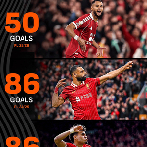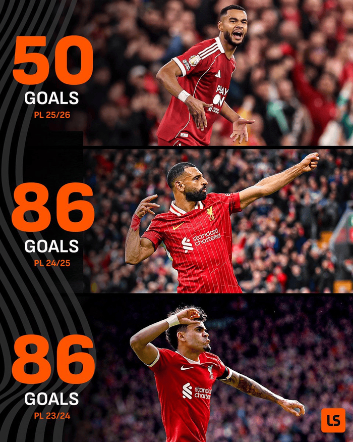 利物浦本赛季进攻乏力,英超目前仅打进50球,而过去两个赛季的联赛总进球数都达到86球。换言之,即便最后7轮每场打进5球,利物浦本赛季联赛总进球数也只能来到85球,依旧无法追平前两个赛季。