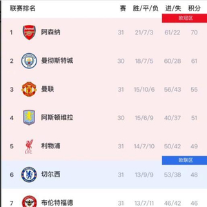 积分榜上,形势也随之出现变化。阿森纳在31轮过后以70分继续领跑,曼城30轮61分排名第二,曼联31轮55分位列第三,少赛一场的阿斯顿维拉以51分排在第四。利物浦本轮输球后停在49分,切尔西则在客场落败后以48分排在第六。虎扑官方积分榜目前就是这样的前六格局。