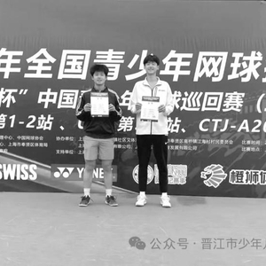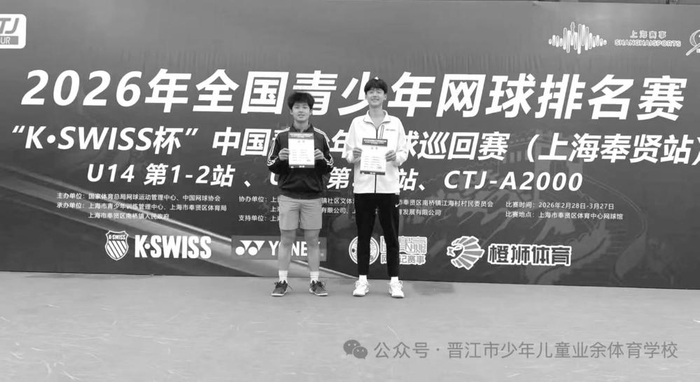 本报讯 (记者 李诗怡) 近日,2026年全国青少年网球排名赛(上海奉贤站)举行,晋江市少体校培养输送的运动员丁祖爖表现出色,与队友并肩作战,在U14组男子双打项目中勇夺季军。