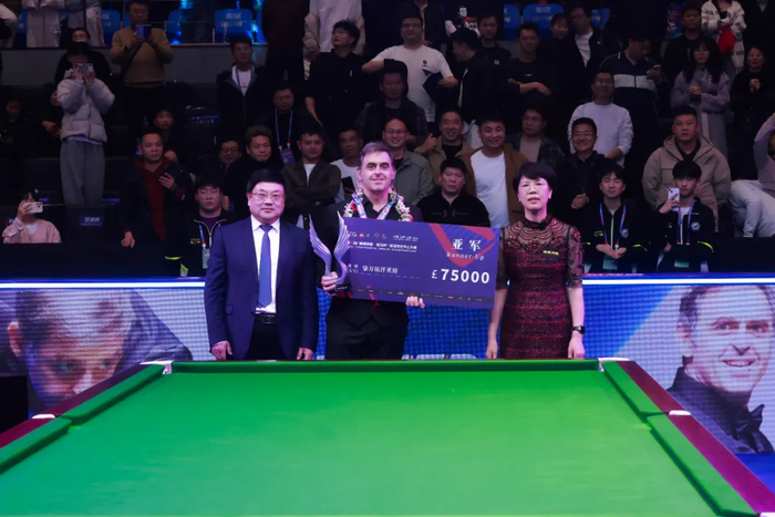 徐方琴为亚军球员奥沙利文颁发亚军奖金7.5万英镑和花环,玉山县人大常委会主任张常青为奥沙利文颁发亚军奖牌和奖杯。