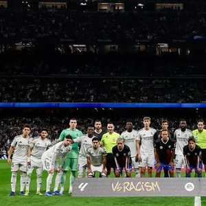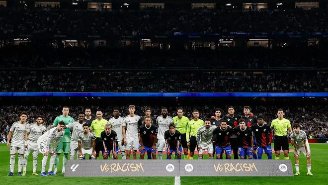 在伯纳乌球场的马德里德比开始前,皇家马德里和马德里竞技的球员以及裁判团队与一幅标语牌合影,以支持当天开展的反种族主义宣传运动。