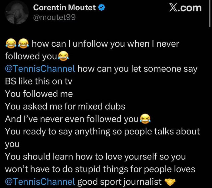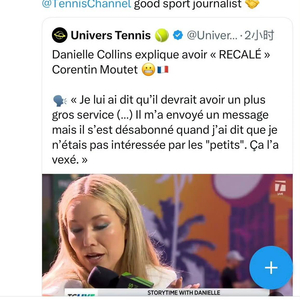 这段采访播出后,迅速在社交媒体上发酵。而穆泰显然也看到了这段内容,他很快在社交平台上发布了一条措辞激烈的推文,直接对柯林斯和《网球频道》开火。